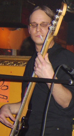 Our bass wizard, as did five other eighths of the group, studied at Conservatory of Kuopio. His dark & brooding figure is most often met at the numerous dance pavilions of our fine country. Or in the bars. Best mention the bars, here. We've got a lot of those, too. With Sami this Old Master of The Beat lays a concrete-solid foundation for our younger and more animated players to frolic upon. In addition to playing the bass Jussi votes Father Jack, wears black and seldom smiles.